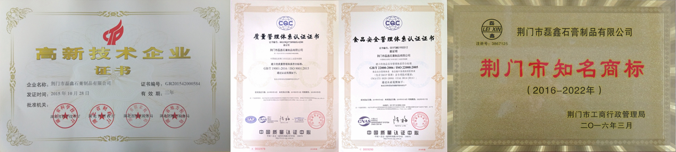 國家高新技術(shù)企業(yè)!湖北省專精特新中小企業(yè)!湖北省支柱產(chǎn)業(yè)細(xì)分領(lǐng)域隱形冠軍培育企業(yè)!湖北省守合同重信用企業(yè)!湖北省兩化融合示范企業(yè)!荊門市知名商標(biāo)!中國高純、高白、高亮、超細(xì)硫酸鈣(石膏)生產(chǎn)基地!中國取得《食品生產(chǎn)許可證》的食品添加劑硫酸鈣(石膏)供應(yīng)商!中國取得《飼料添加劑生產(chǎn)許可證》和《產(chǎn)品批準(zhǔn)文號》硫酸鈣供應(yīng)商!中國取得《出口飼料生產(chǎn)、加工、存放企業(yè)檢驗檢疫注冊登記證》飼料添加劑硫酸鈣供應(yīng)商!通過ISO9001國際質(zhì)量管理體系認(rèn)證!通過ISO22000國際食品安全管理體系認(rèn)證!通過HALAL國際清真認(rèn)證!通過KOSHER猶太認(rèn)證! 荊門市磊鑫石膏制品有限公司成立于2002年,位于石膏資源富集的湖北省荊門市東寶區(qū)工業(yè)園幸福路,占地27000余平方米,是一家在業(yè)內(nèi)享有盛譽(yù)的集石膏、石膏粉和硫酸鈣制品研發(fā)、生產(chǎn)、銷售于一體的高新技術(shù)企業(yè)。公司擁有 “磊鑫”、“杰普生”、“凱氏蘇特”等5個國家注冊商標(biāo),2個發(fā)明專利,18個實(shí)用新型專利,50余篇自有技術(shù)應(yīng)用研究,36篇權(quán)威期刊發(fā)表技術(shù)論文。主要產(chǎn)品有:醫(yī)藥級硫酸鈣、食品級硫酸鈣、飼料添加劑硫酸鈣、人造石透明填充粉,凱色粉、涂料及化妝品功能性填料和特級半水纖膏粉、混合石膏粉、模型石膏粉,建筑石膏粉等九大系列50余種產(chǎn)品。公司享有自營進(jìn)出口權(quán),客戶遍布全世界,是多家公司、集團(tuán)和世界500強(qiáng)企業(yè)的優(yōu)秀供應(yīng)商!產(chǎn)品遠(yuǎn)銷到韓國、日本、俄羅斯、中國臺灣、東南亞、歐美、中東、非洲等國家和地區(qū)。公司緊靠207國道,焦柳鐵路穿境而過,距漢江碼頭50公里,長江沙市港90公里。交通運(yùn)輸便利,確保及時供貨。“待用戶為上帝誠信為本,視質(zhì)量為生命持之以恒!”是我們的企業(yè)宗旨,與我們合作是您明智的選擇,共謀發(fā)展是我們共同的目標(biāo)!歡迎垂詢,歡迎惠顧! Your Trusted Source For Food-Grade Calcium Sulfate!——做全球更好的食品級硫酸鈣(石膏)供應(yīng)商! ——CGC·磊鑫石膏
